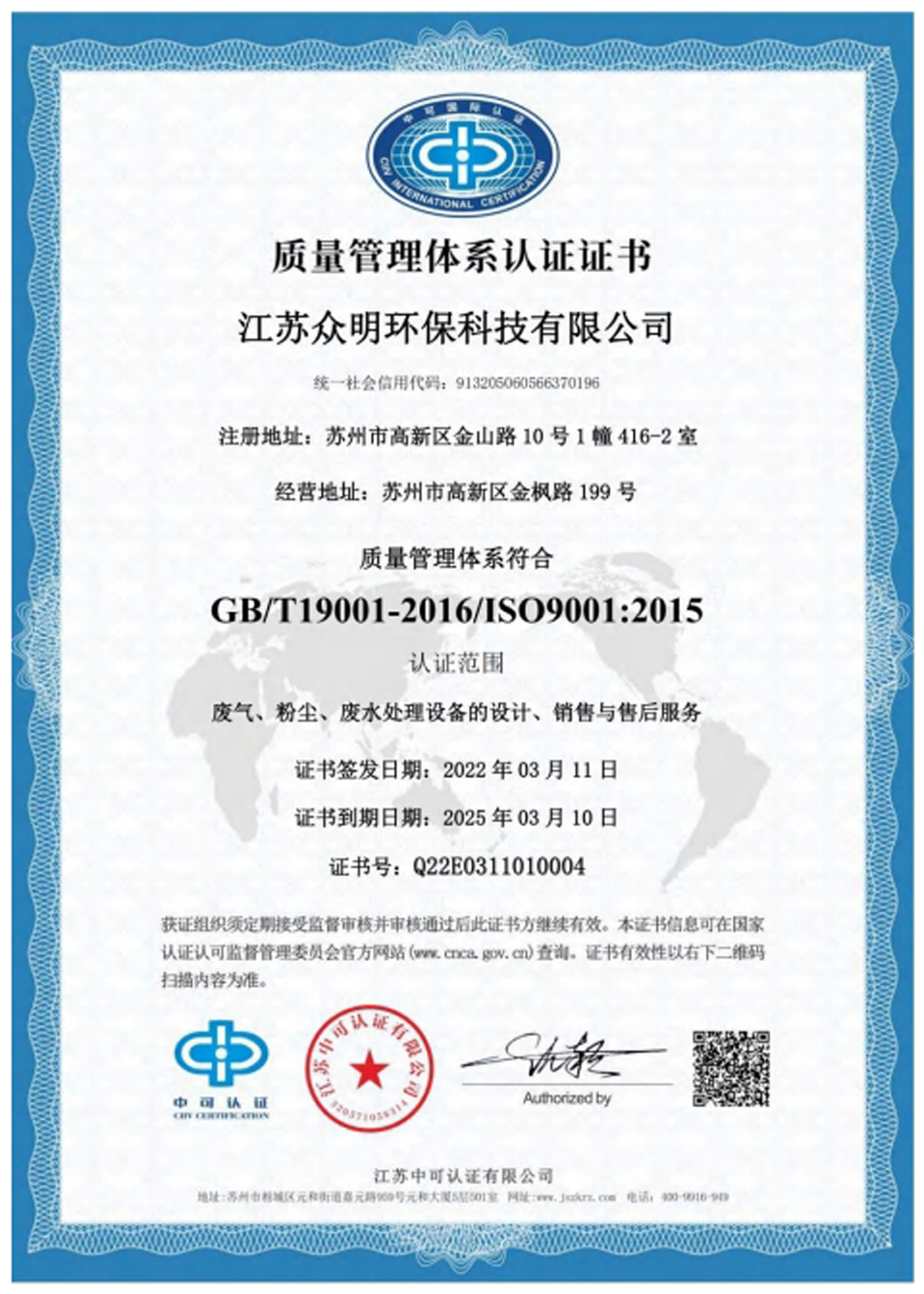 環(huán)境管理體系認(rèn)證證書(shū)